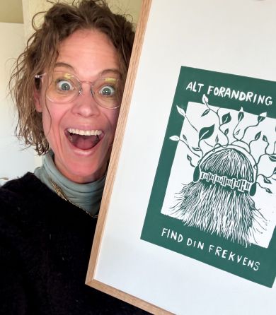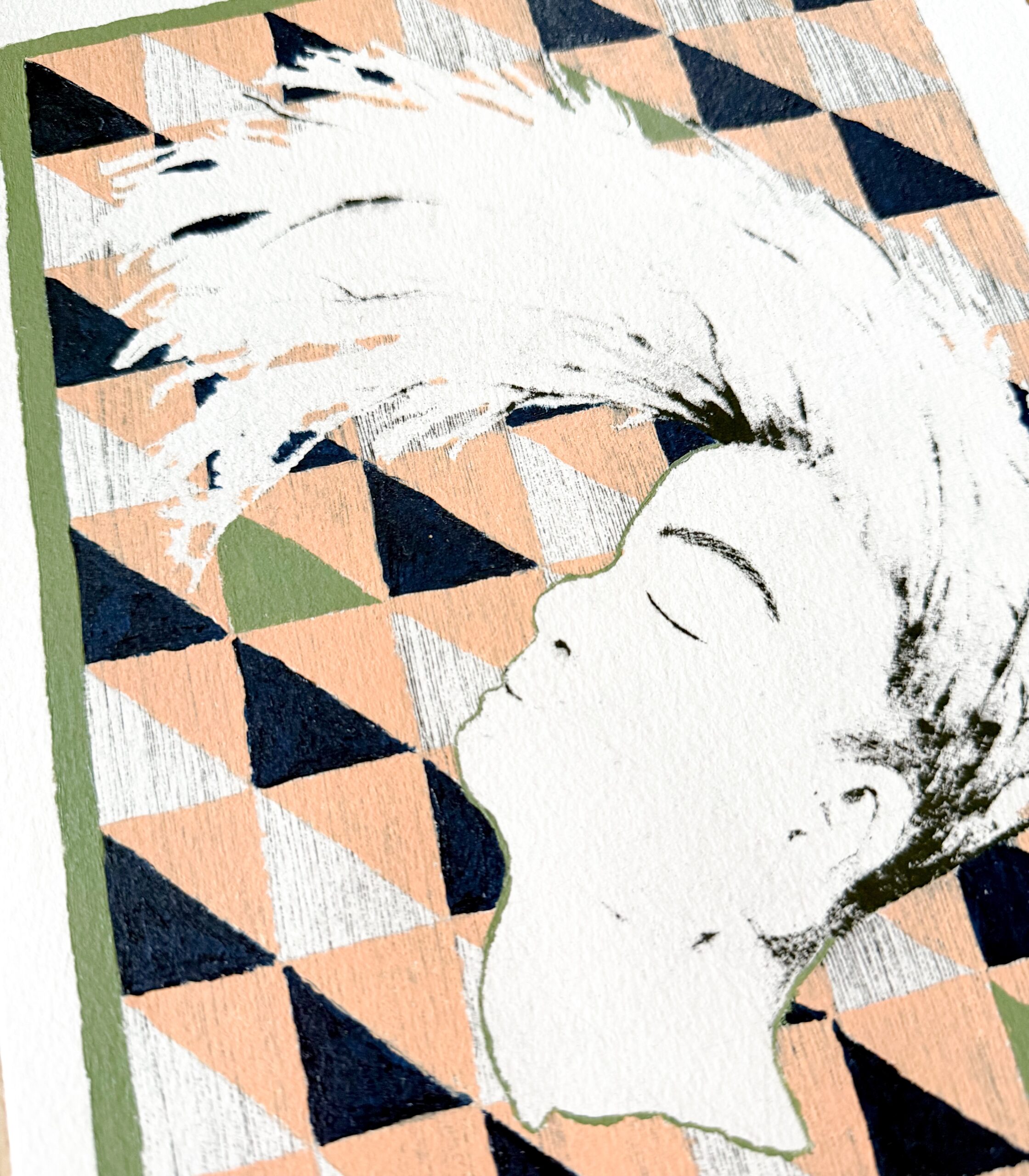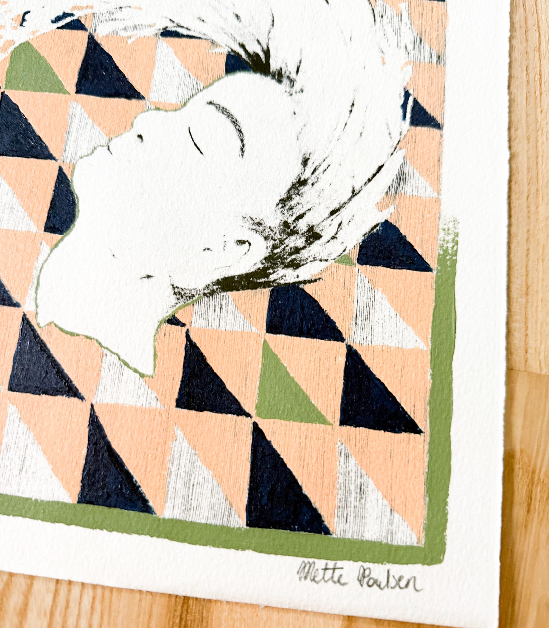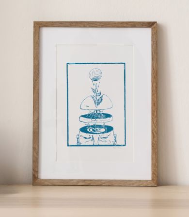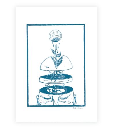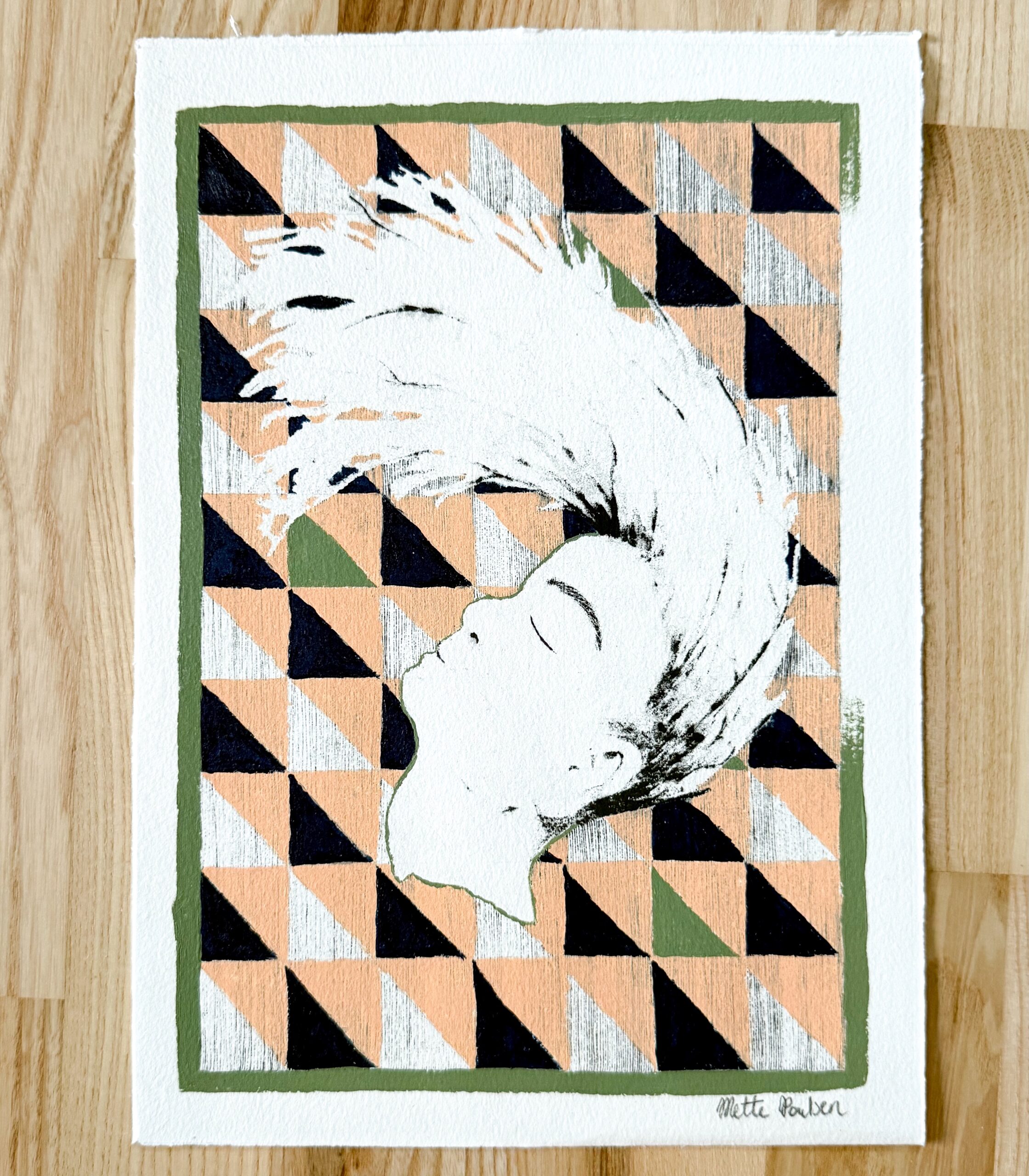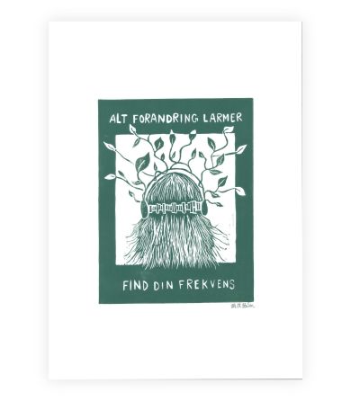 De sorte streger, som danner et ansigtligende væsen, er et xerolitografi tryk. Hvilket gør værket helt specielt og unik. Trykket giver en blødhed til værket, som er svær at fange på billeder. Efter trykket er færdig er det blevet malet på med akrylmaling.