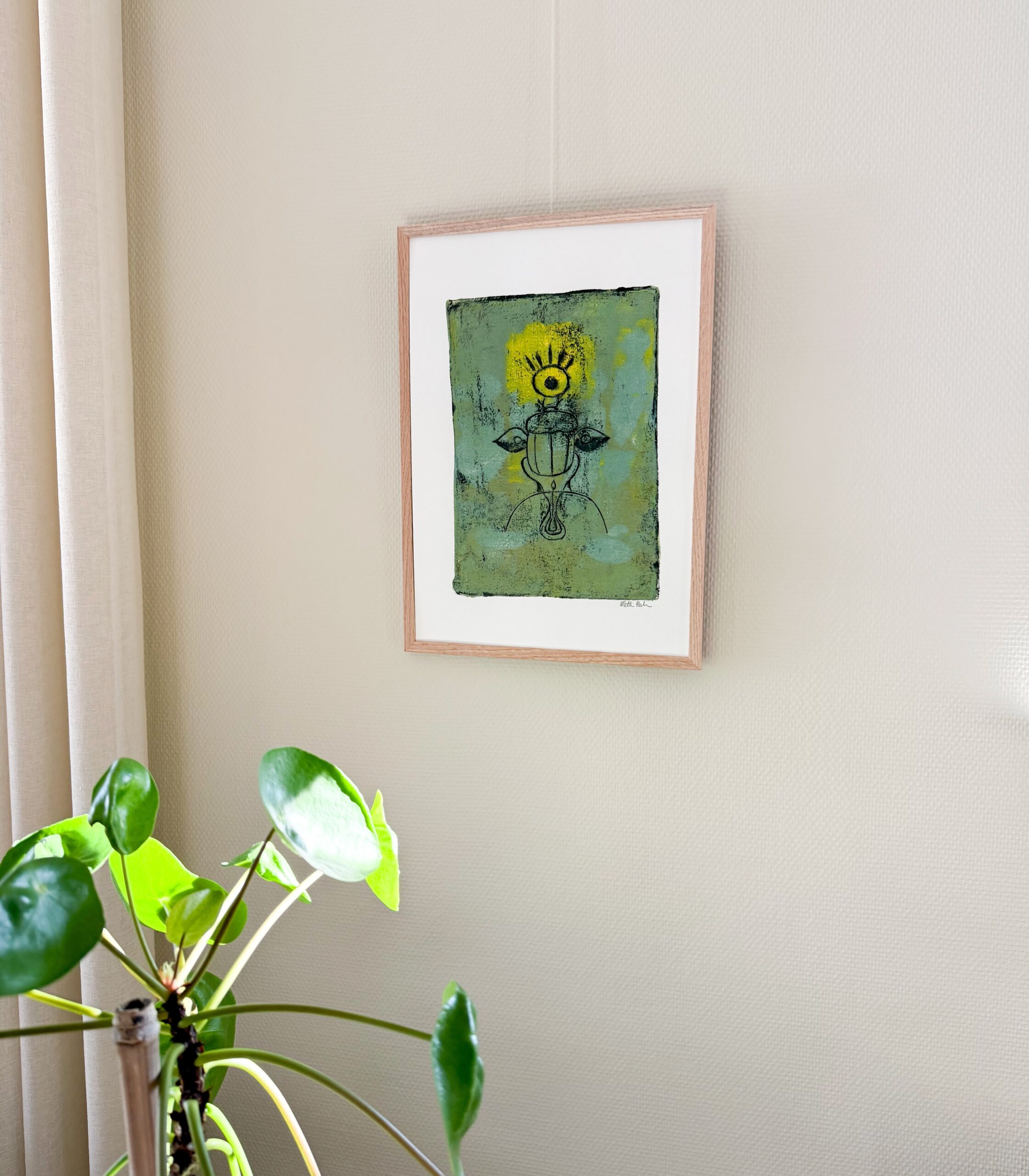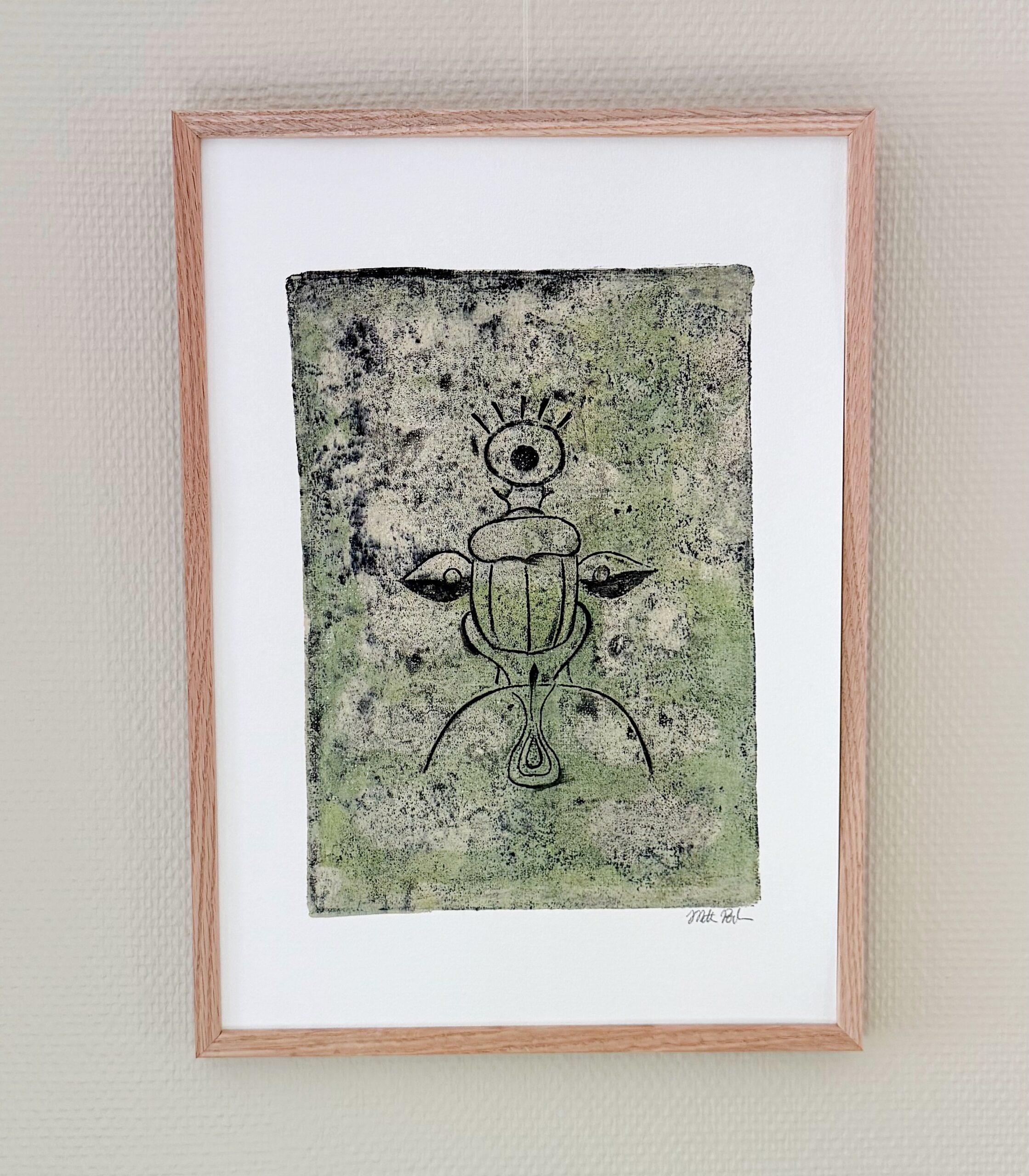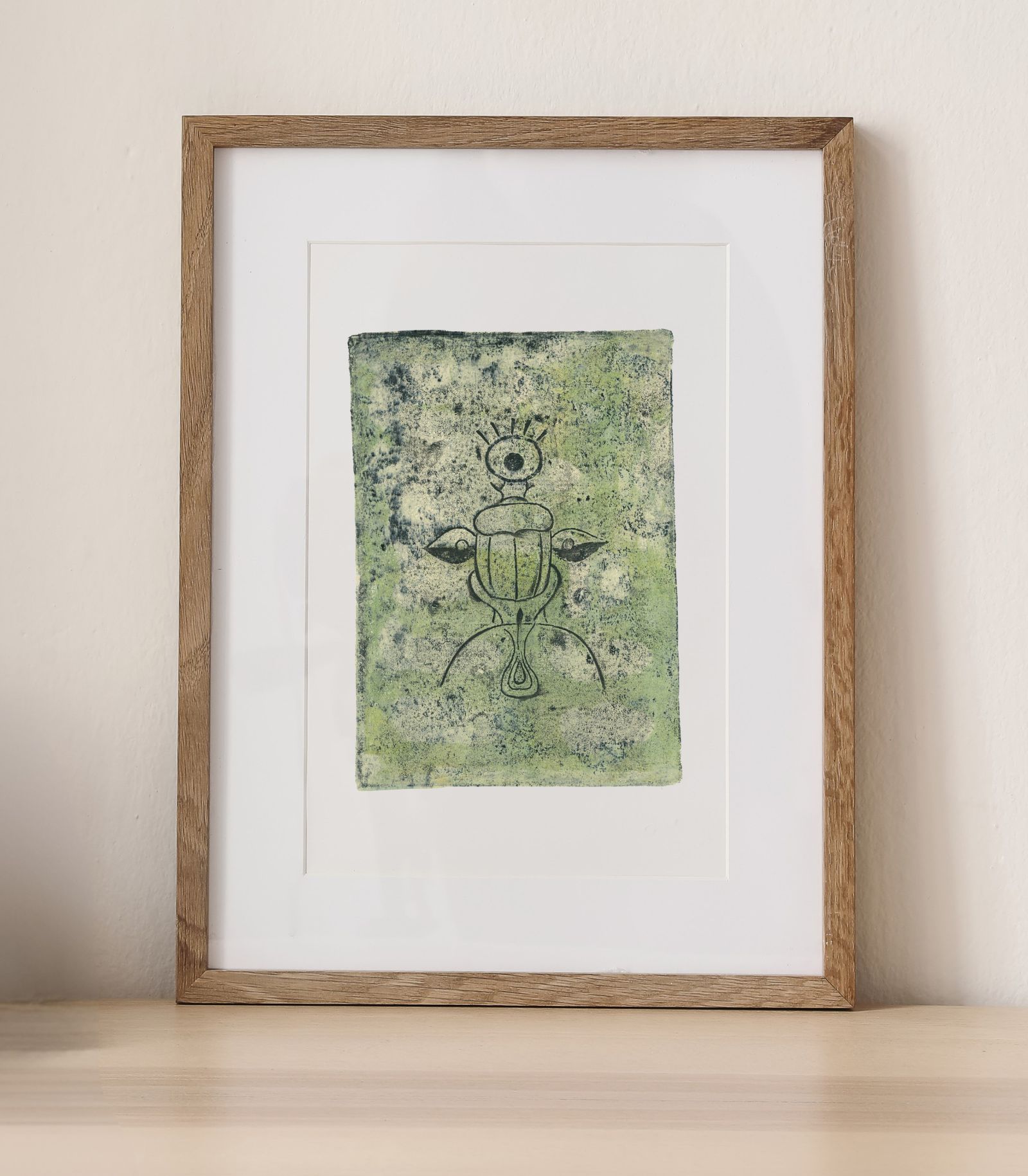 Dette unikke geltryk forener skarabæens symbolske kraft med naturens vækst. Med et øje mellem følehornene og vinger, der ser både lys og mørke, symboliserer værket indsigt, forandring og balance. Håndlavet og signeret – skabt til dig, der værdsætter kunst med dybde.