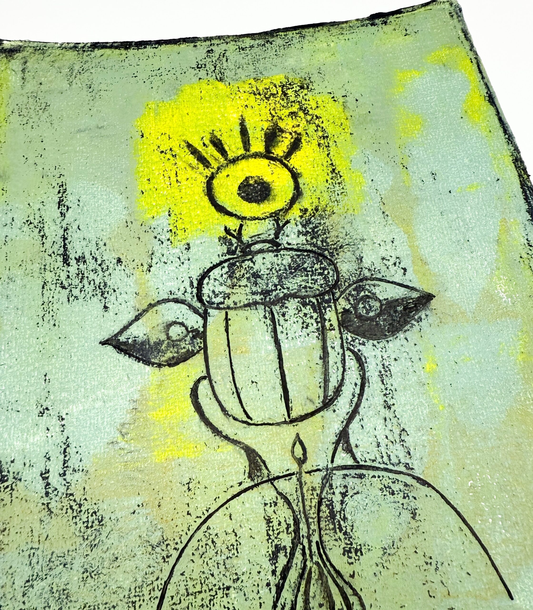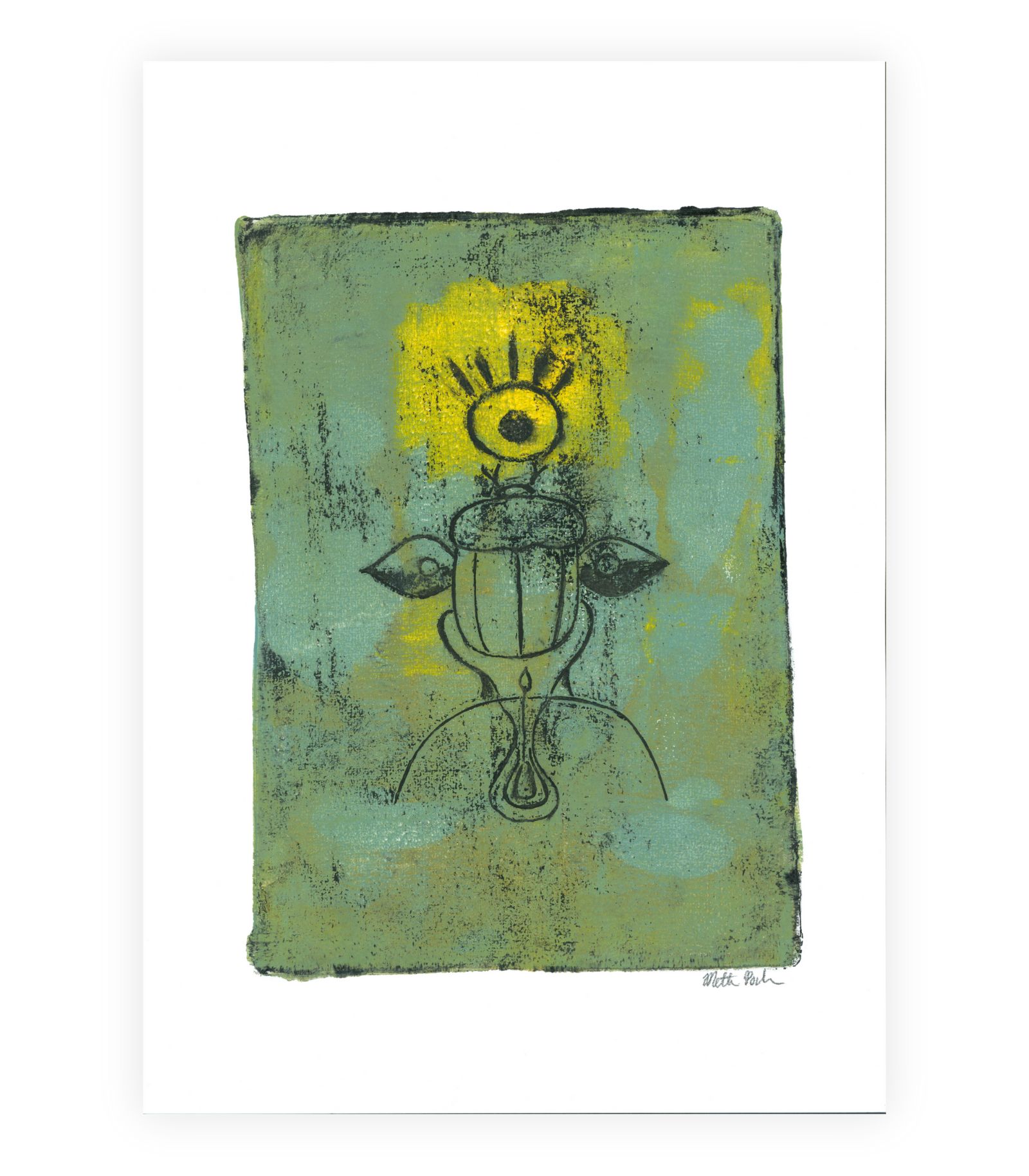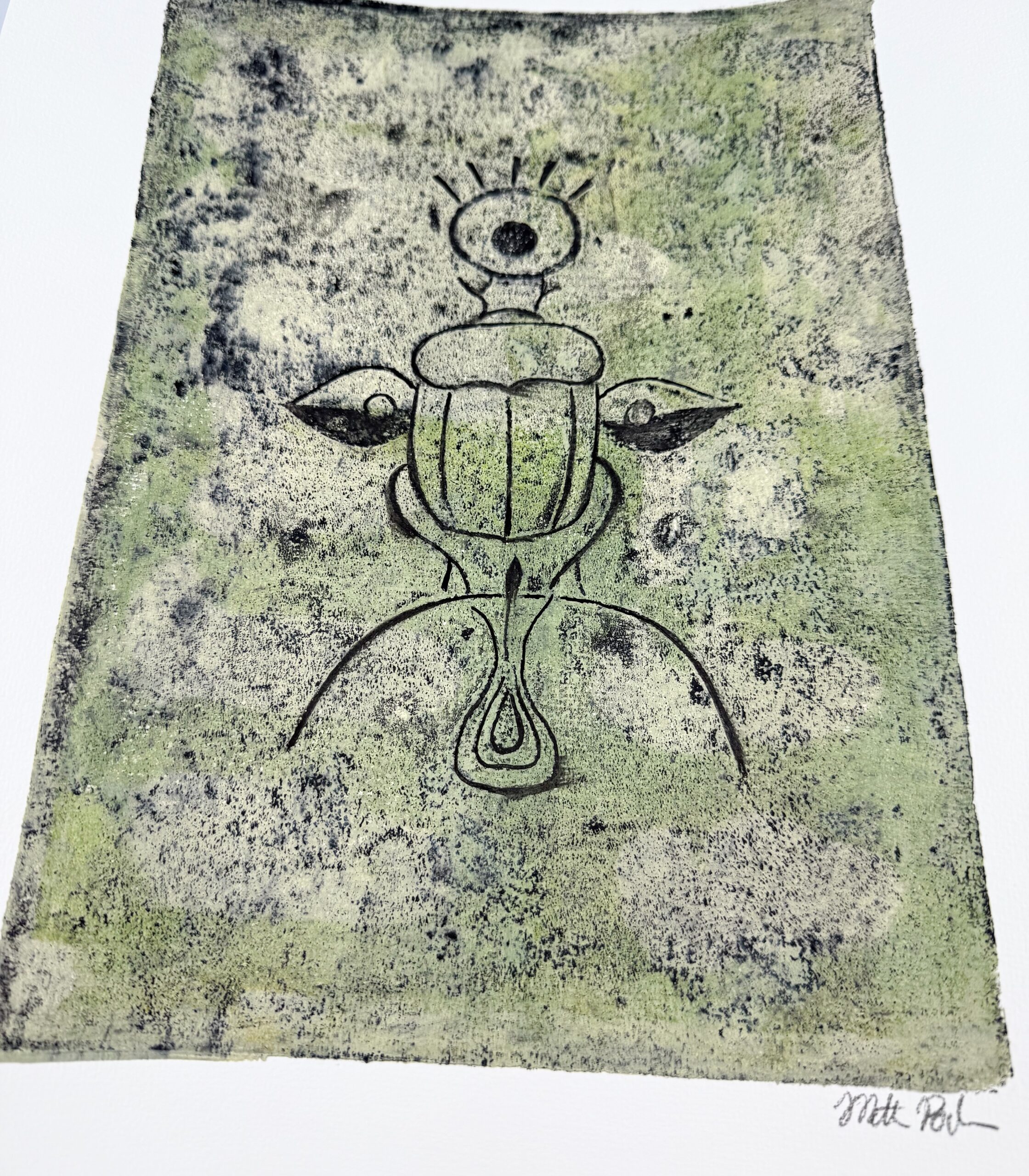 Dette unikke geltryk forener skarabæens symbolske kraft med naturens vækst. Med et øje mellem følehornene og vinger, der ser både lys og mørke, symboliserer værket indsigt, forandring og balance. Håndlavet og signeret – skabt til dig, der værdsætter kunst med dybde.