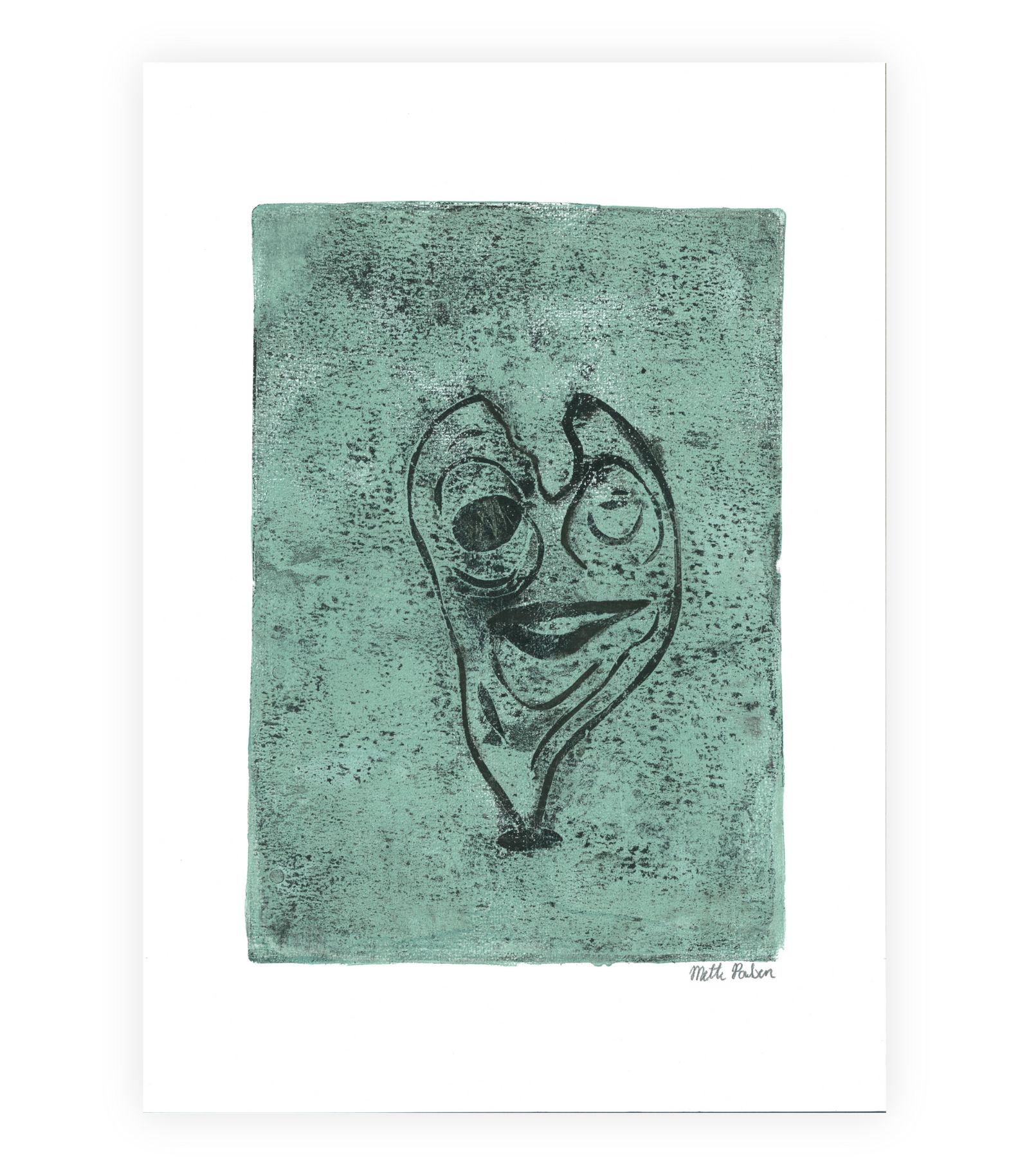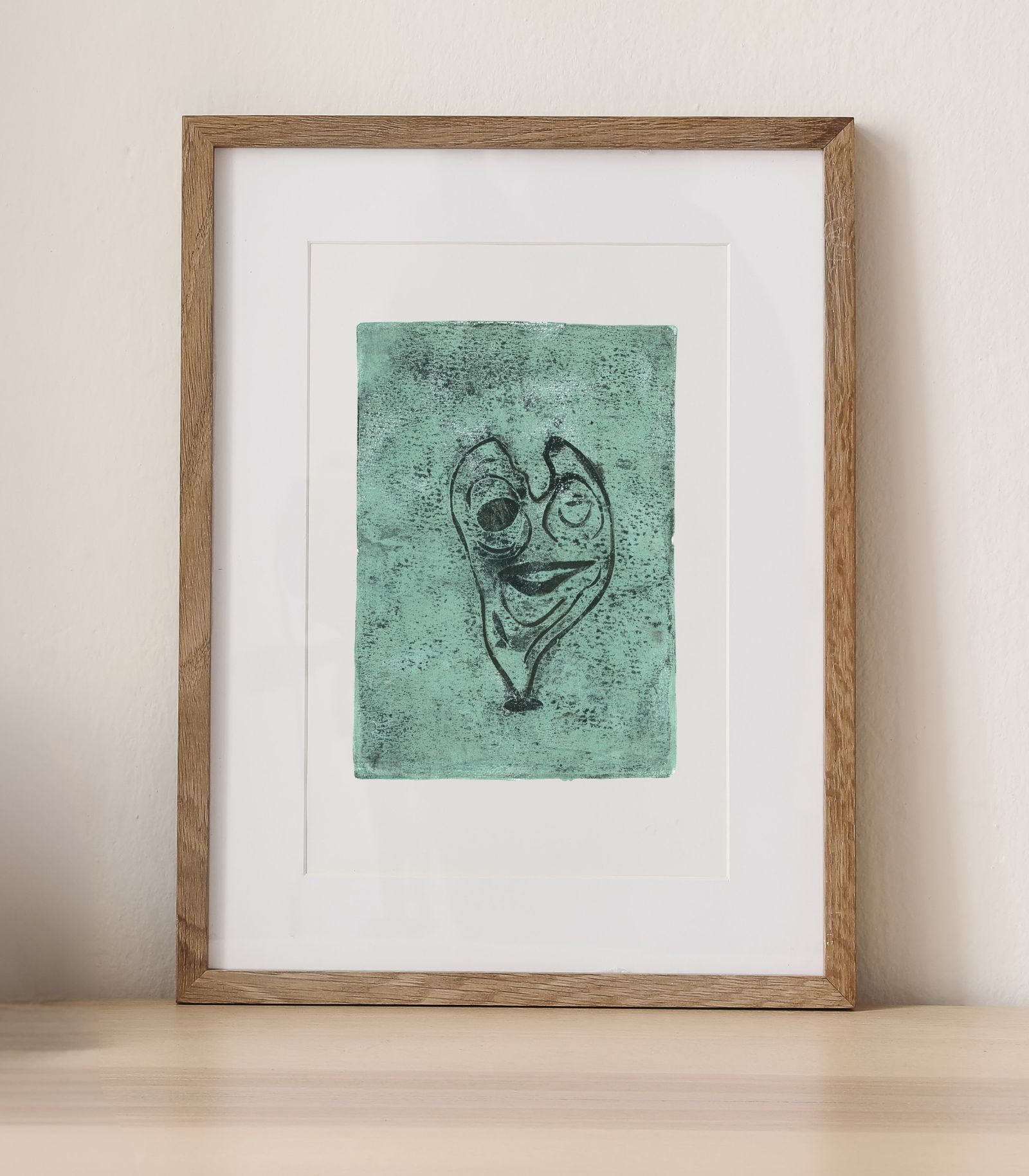 “Sprede Smil” er et håndlavet geltryk, der forener glæde og eftertænksomhed i ét værk. Ansigtets skæve linjer og unikke udtryk skaber en stærk forbindelse til betragteren. Baggrunden er præget af varme beige toner og dybe sorte detaljer. Sammen skaber de en tekstureret og levende oplevelse.